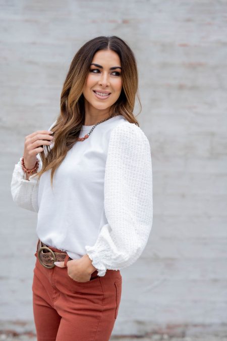 How cute is this blouse? With woven textured sleeves and a solid body, this is a piece that you can dress up or down, depending on what you want! We love the comfort of a tee and the look of a blouse within this piece. The cinched detailing on the…