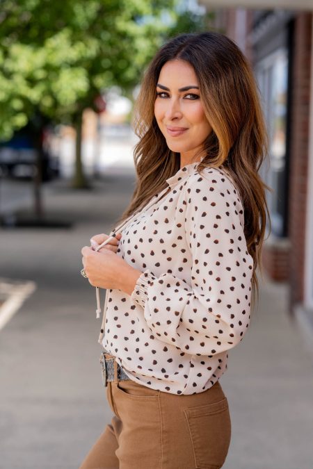 How cute is this blouse? With dotted sleeves and a solid body, this is a piece that you can dress up or down, depending on what you want! The cinched detailing on the sleeves elevates this top. It also looks great with a cardigan, vest, blazer, or jacket over it!…