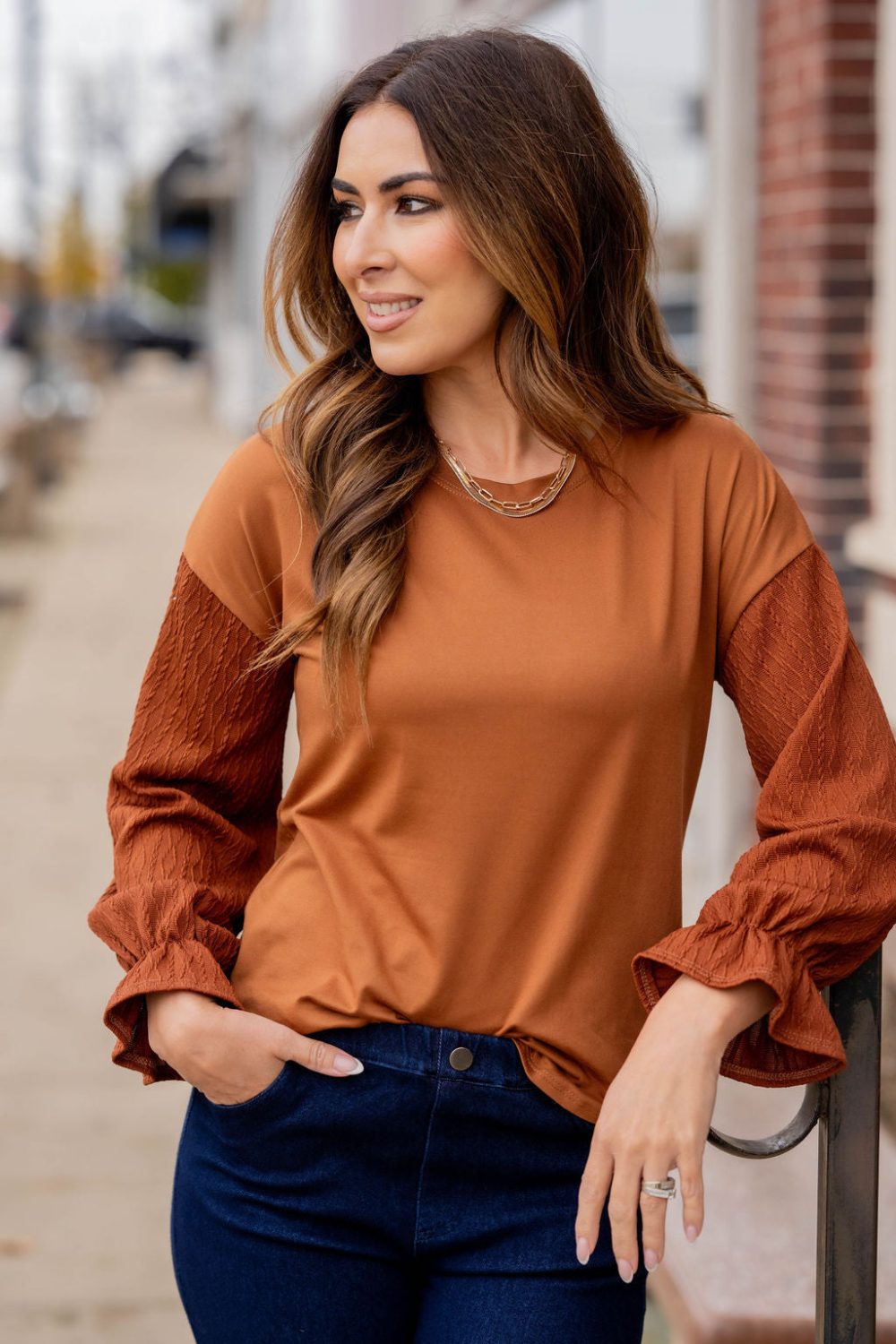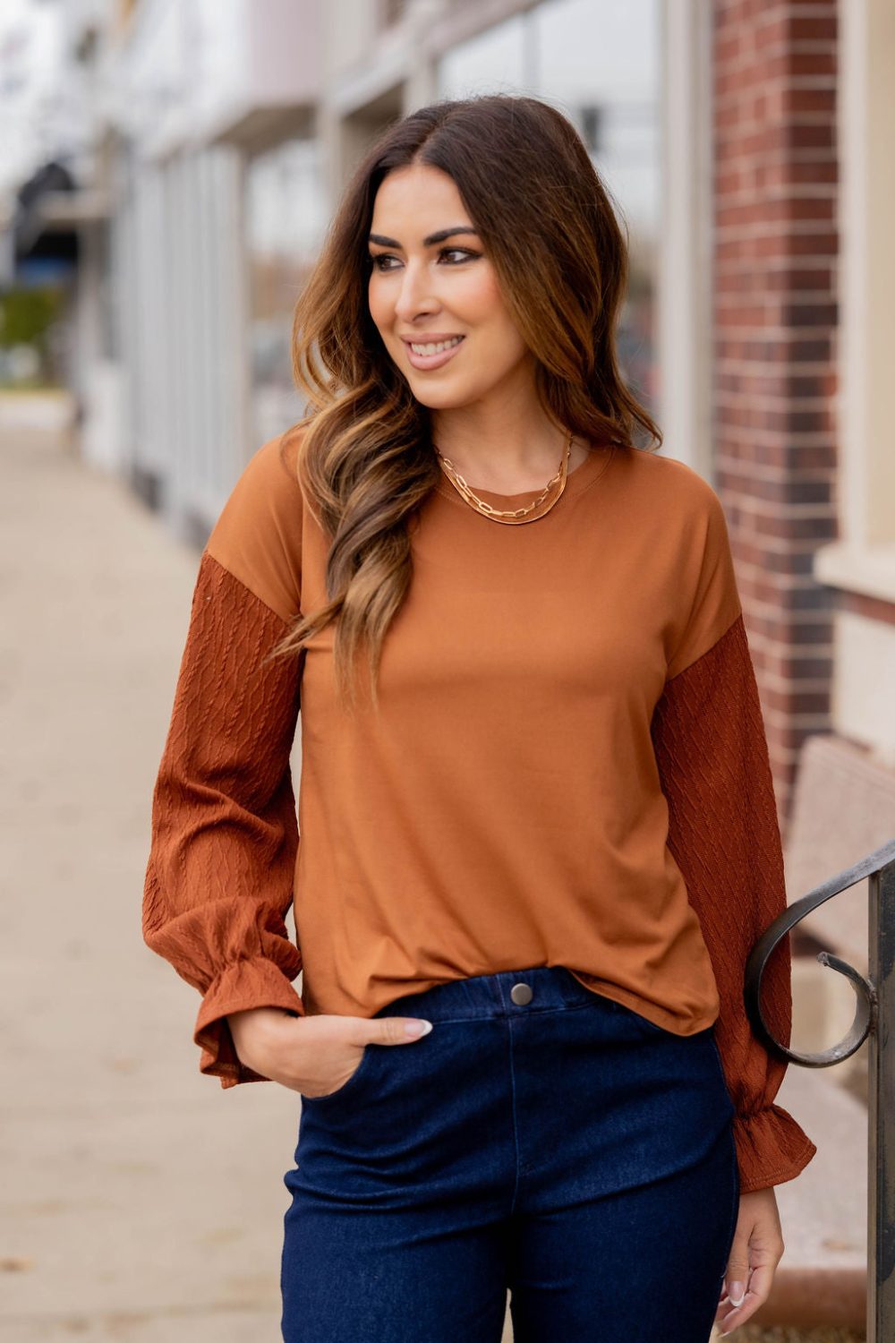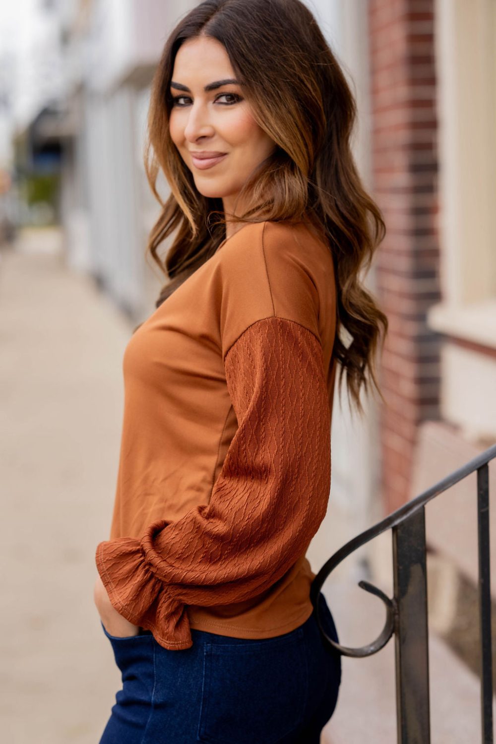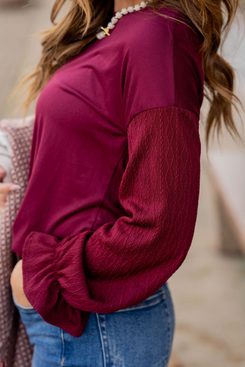 How cute is this blouse? With the braided texture statement sleeves and the solid body, this is a piece that you can dress up or down, depending on what you want! The cinched detailing on the sleeves elevates this top. It also looks great with a cardigan, vest, blazer, or jacket over it!