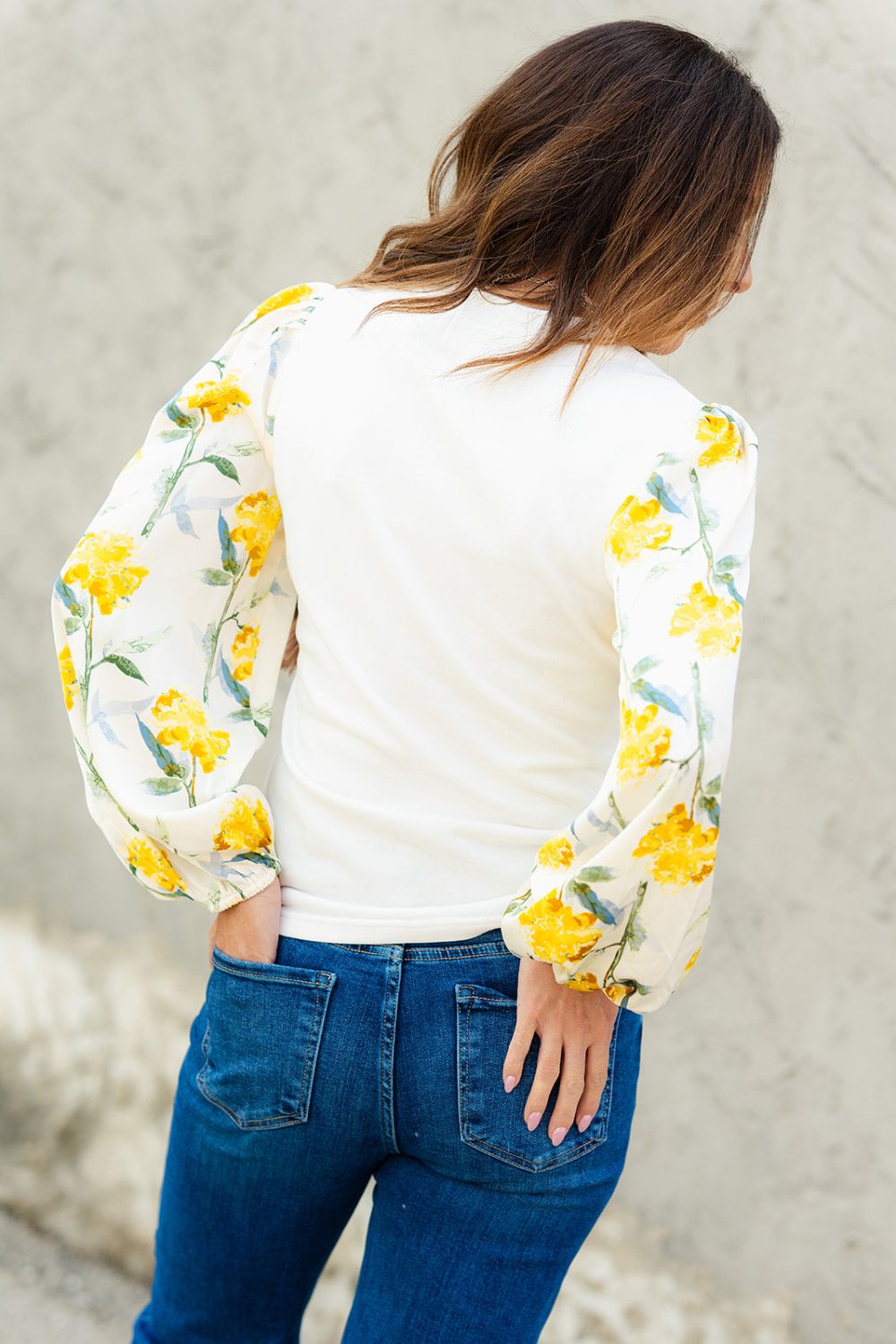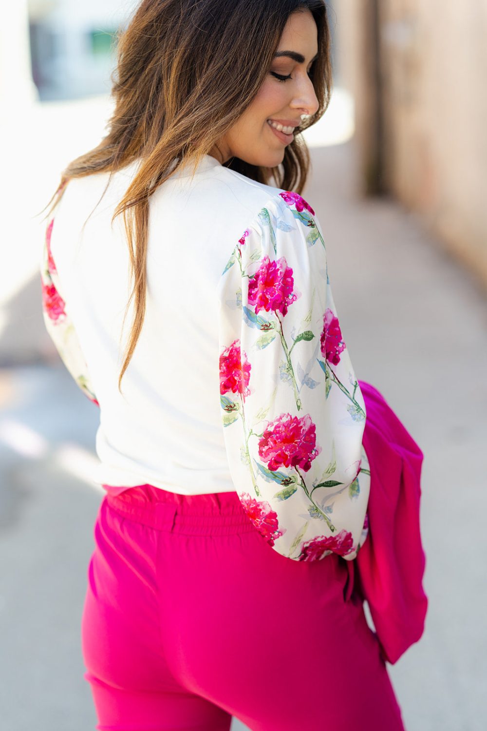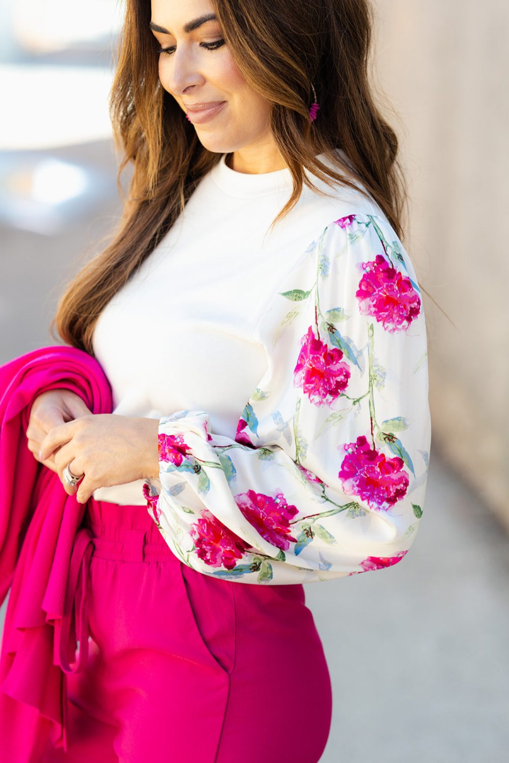 How cute is this blouse? With the stunning floral print sleeves and the solid body, this is a piece that you can dress up or down, depending on what you want! The cinched detailing on the sleeves and bold colors elevate this top. It also looks great with a cardigan, vest, blazer, or jacket over it!