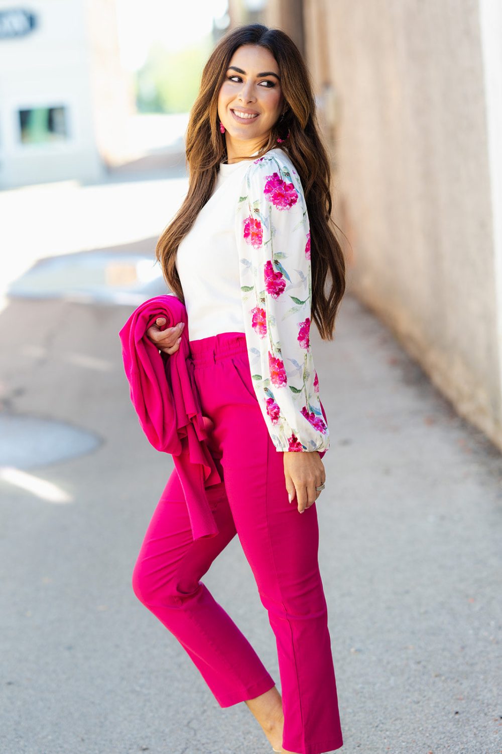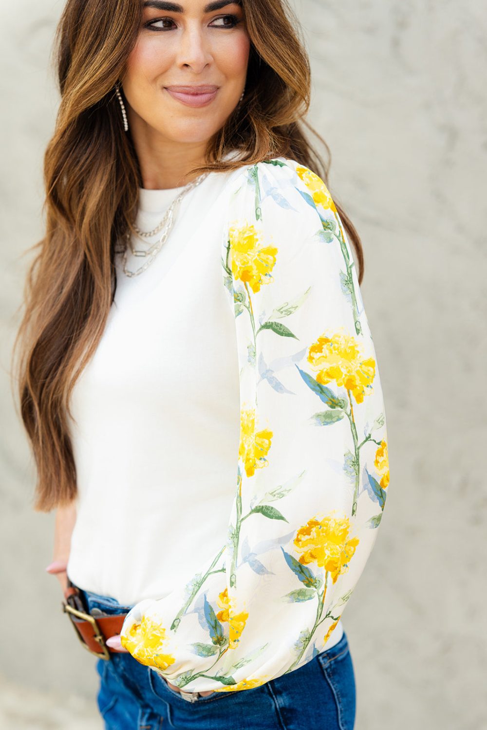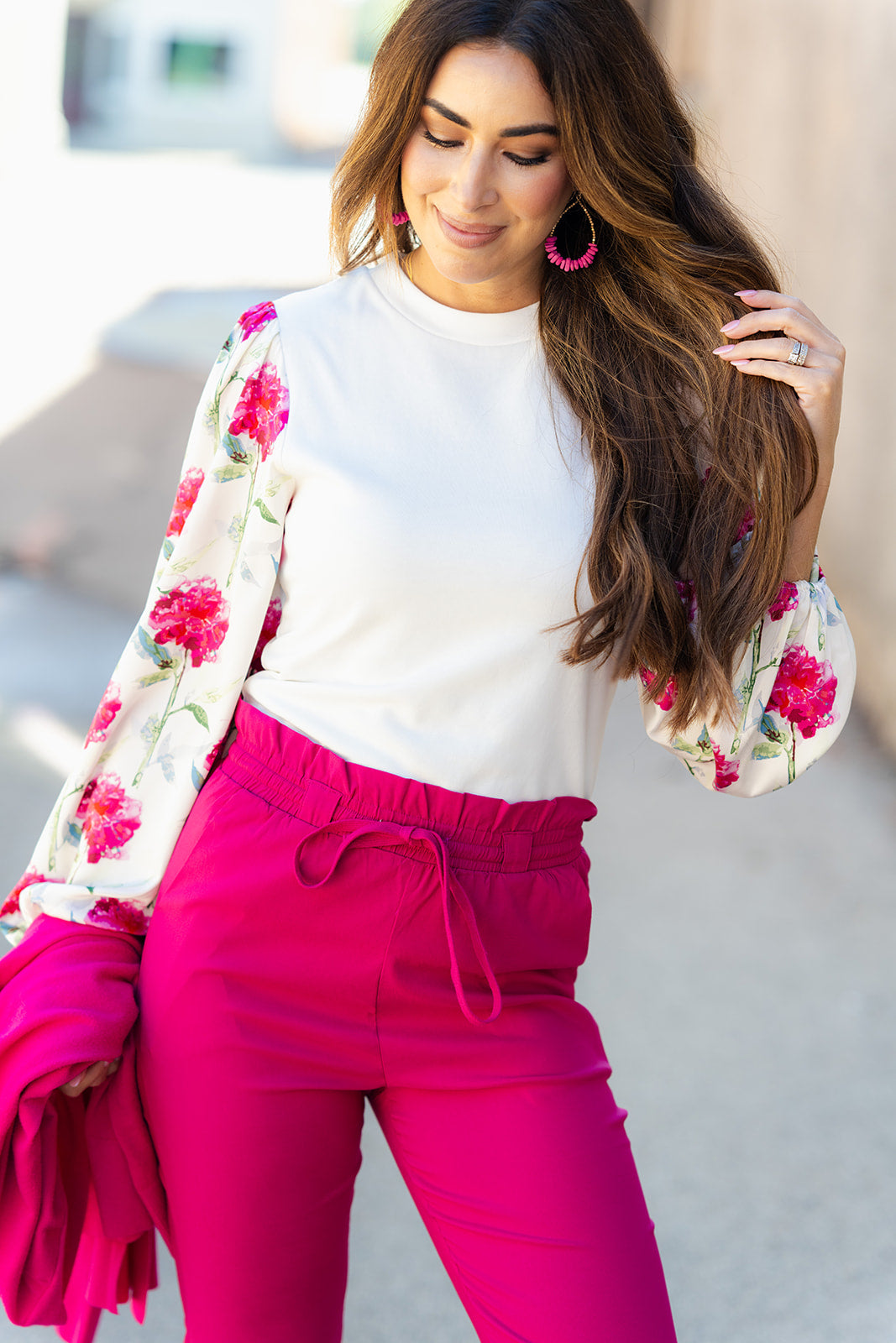 How cute is this blouse? With the stunning floral print sleeves and the solid body, this is a piece that you can dress up or down, depending on what you want! The cinched detailing on the sleeves and bold colors elevate this top. It also looks great with a cardigan, vest, blazer, or jacket over it!