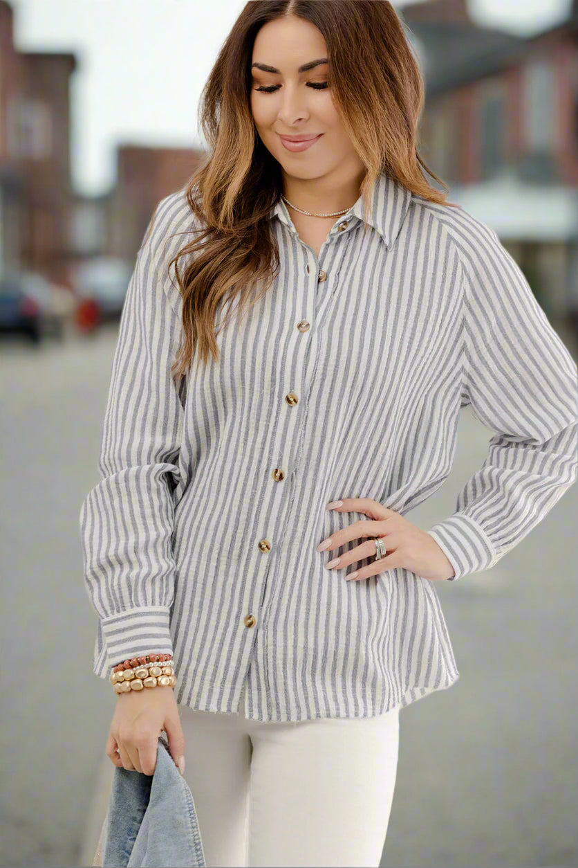 Simple and elegant describes this blouse perfectly. Button-up blouses are a classic, timeless piece. We love the seersucker looks with the raw edge detailing and the lightweight material, making this ideal for every season. Wear buttoned up or leave this open over a basic or graphic tee! Chilly? Add a vest, cardigan, or jacket with ease!