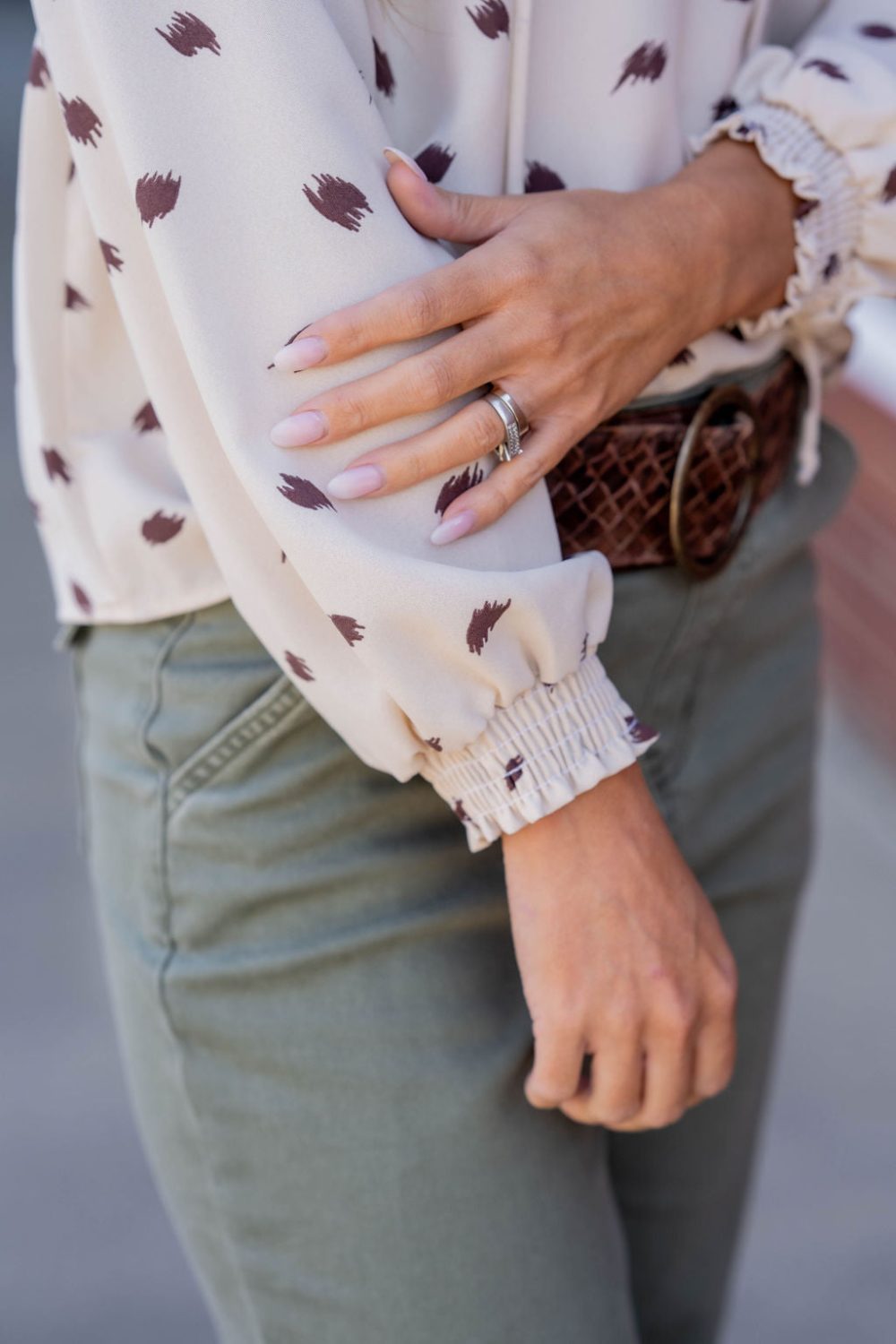 This polka dot top is perfect for quick, unique outfits! We love the colors, pattern, cinching, and the drawstrings. Wear this blouse more casually with your favorite denim or joggers or dress it up by tucking it into a high-waisted skirt or with a pair of our Betsey’s Jeggings and your favorite accessories. Lightweight enough to wear in the warmer months with shorts or layered in the cooler ones. The possibilities are endless with this one.
