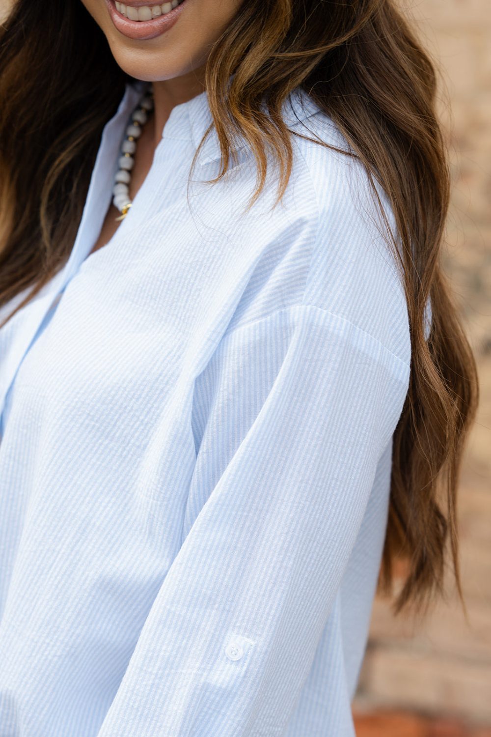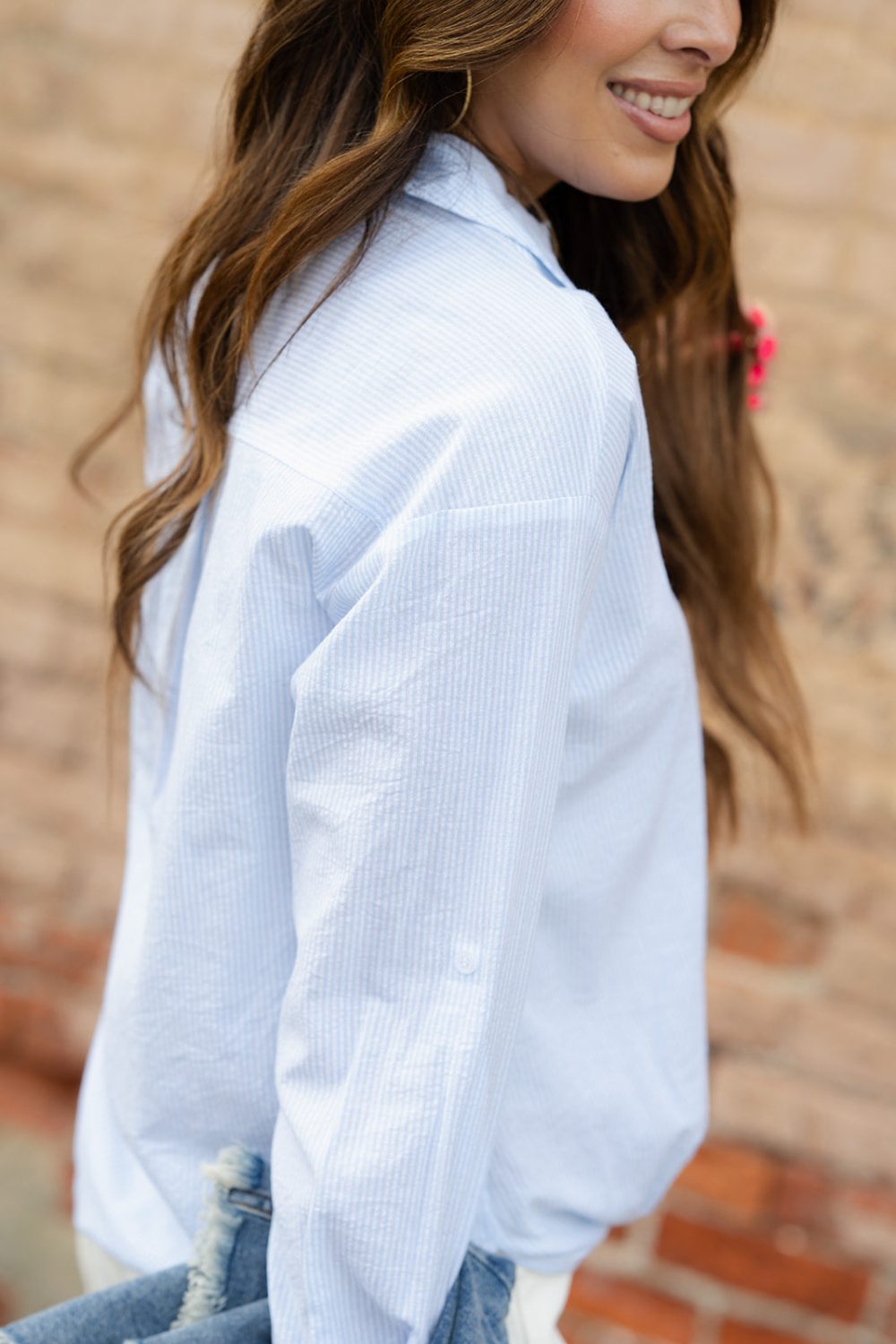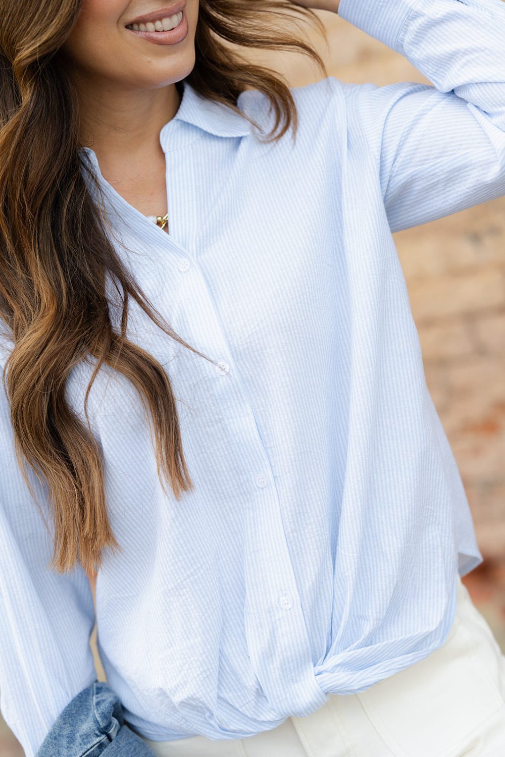Simple and elegant describes this blouse perfectly. Button-up blouses are a classic, timeless piece. We love the classic stripes and the lightweight material making this ideal for every season and the twist bottom detailing gives this that extra bit of pizzaz. Pair with a skirt, your favorite denim, joggers, or our Betsey’s Jeggings for an easy yet pulled together look. Chilly? Add a vest, cardigan, or shacket with ease!
