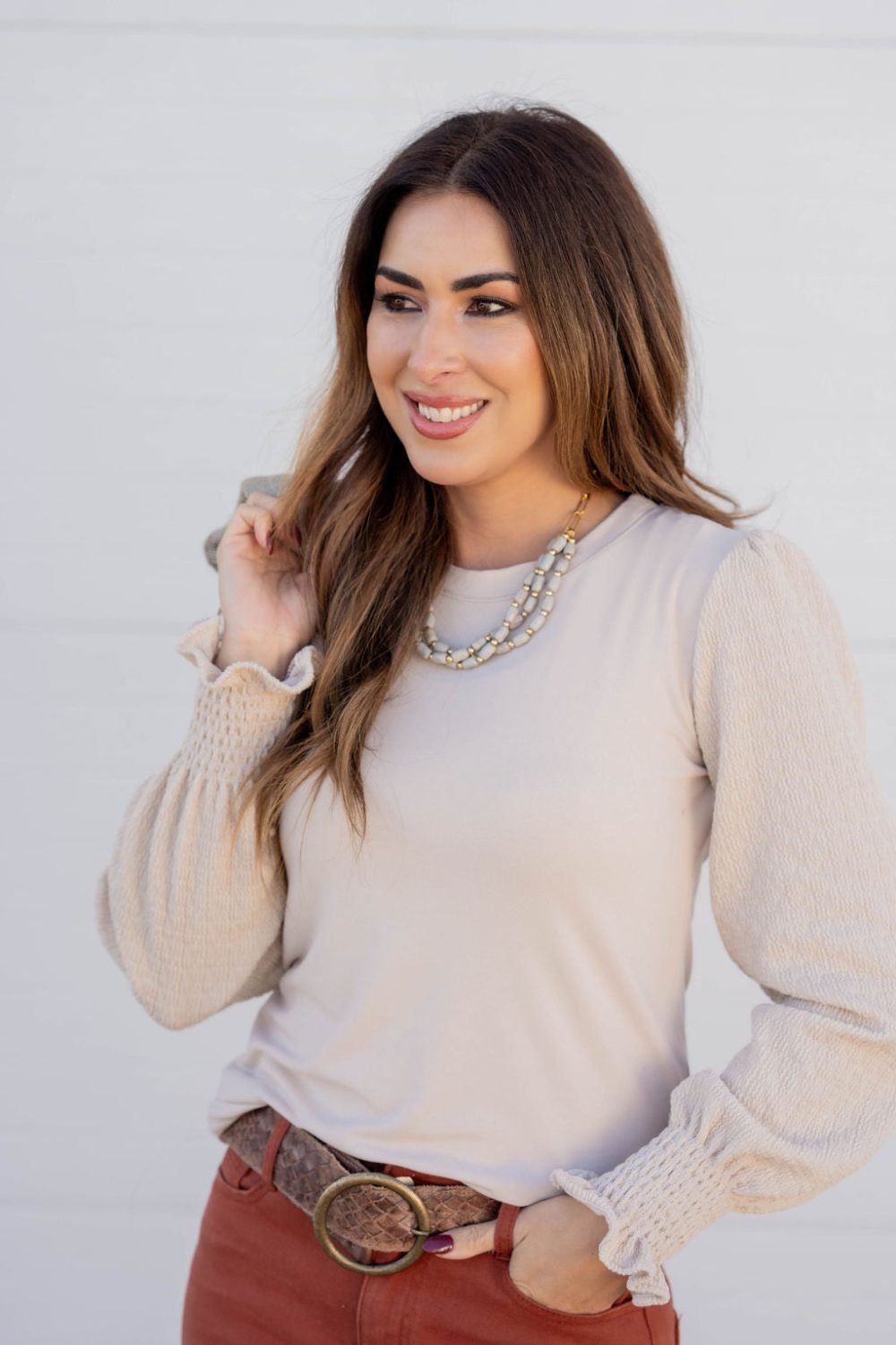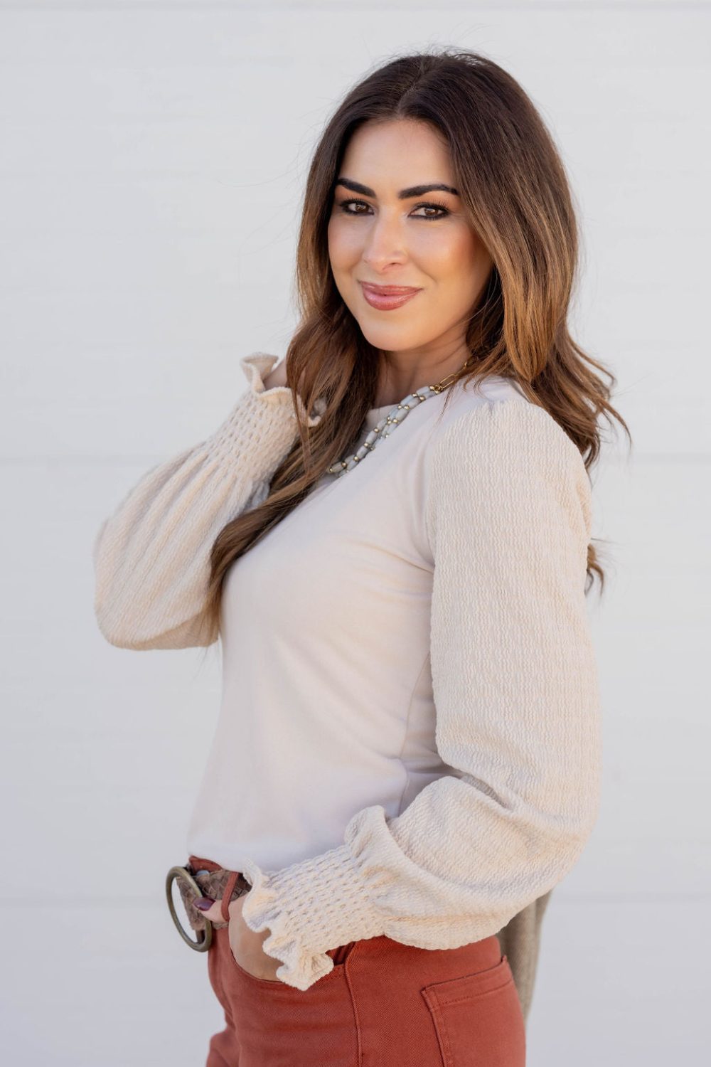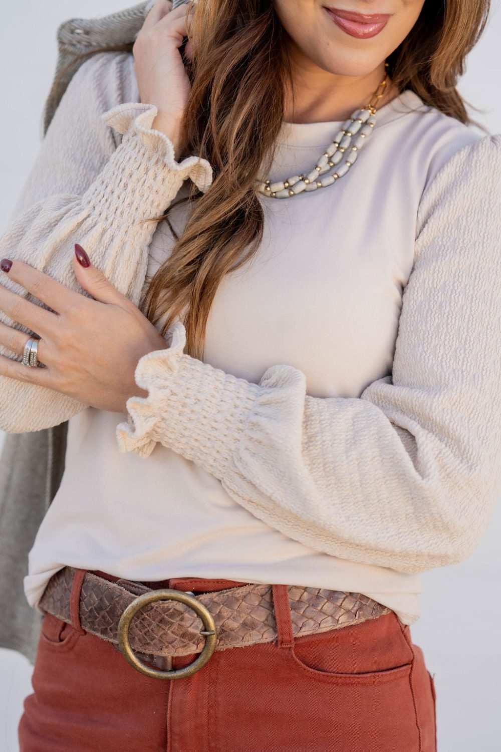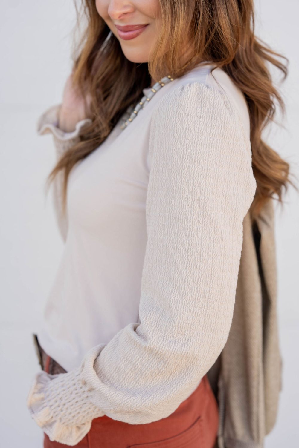 How cute is this blouse? With the subtle textured sleeves and the solid body, this is a piece that you can dress up or down, depending on what you want! The cinched detailing on the sleeves elevates this top. It also looks great with a cardigan, vest, blazer, or jacket over it!