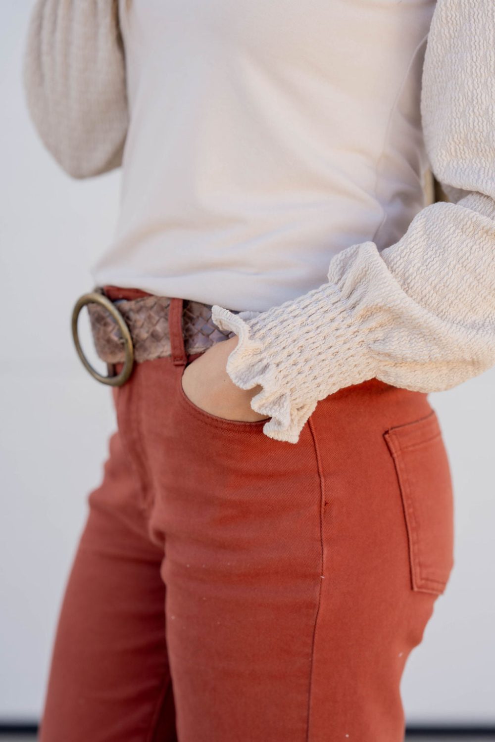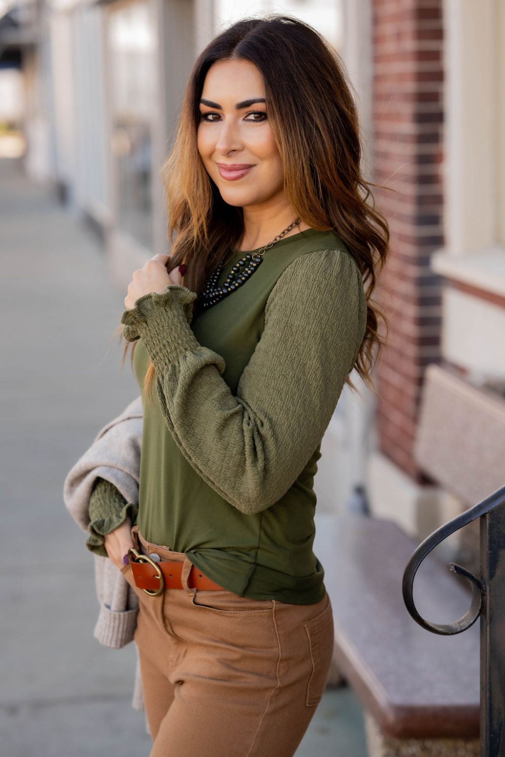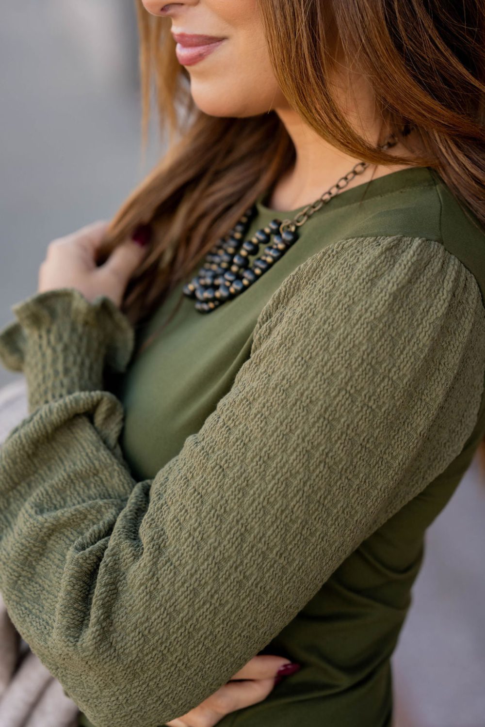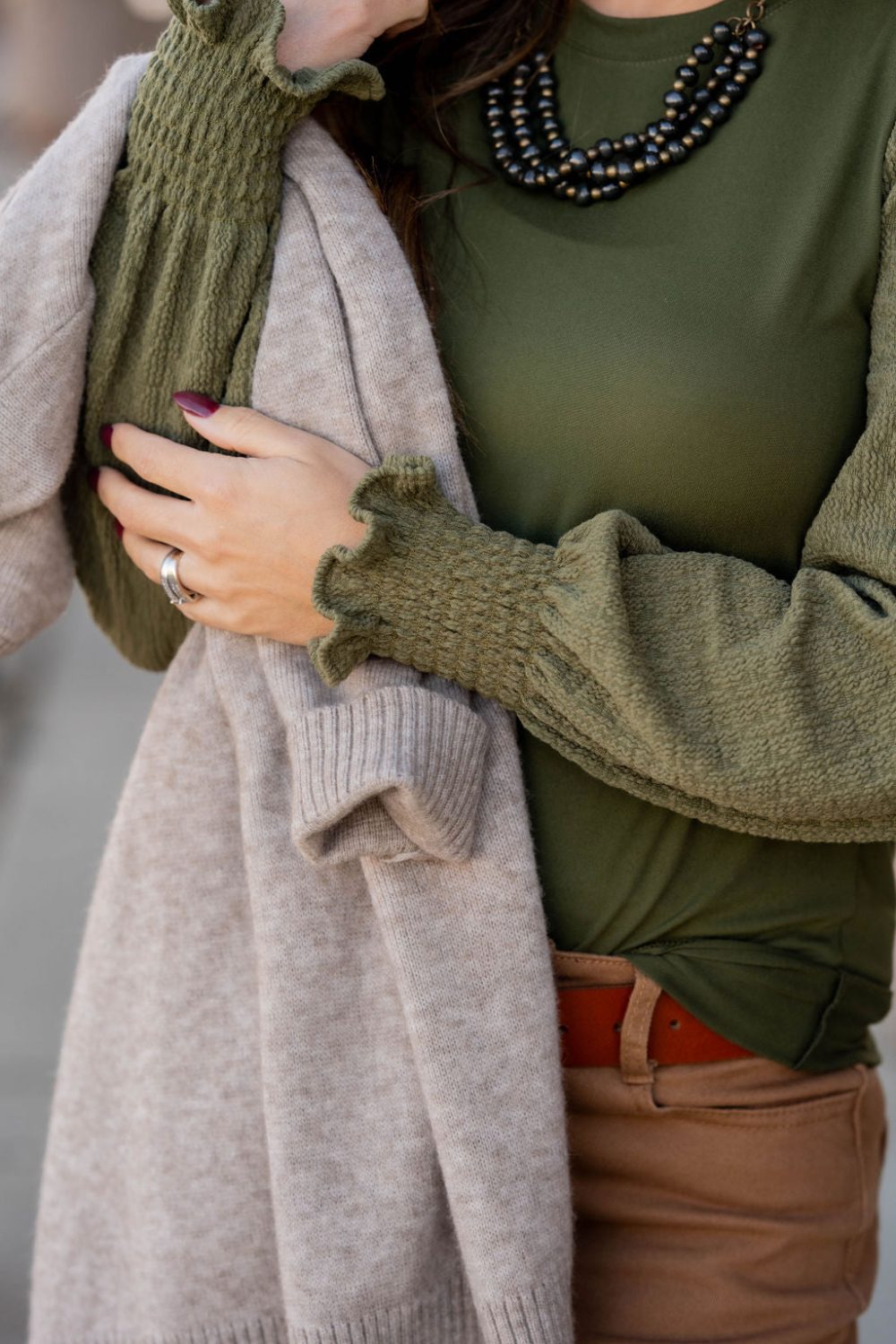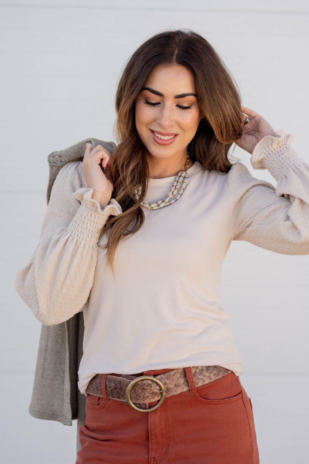 How cute is this blouse? With the subtle textured sleeves and the solid body, this is a piece that you can dress up or down, depending on what you want! The cinched detailing on the sleeves elevates this top. It also looks great with a cardigan, vest, blazer, or jacket over it!