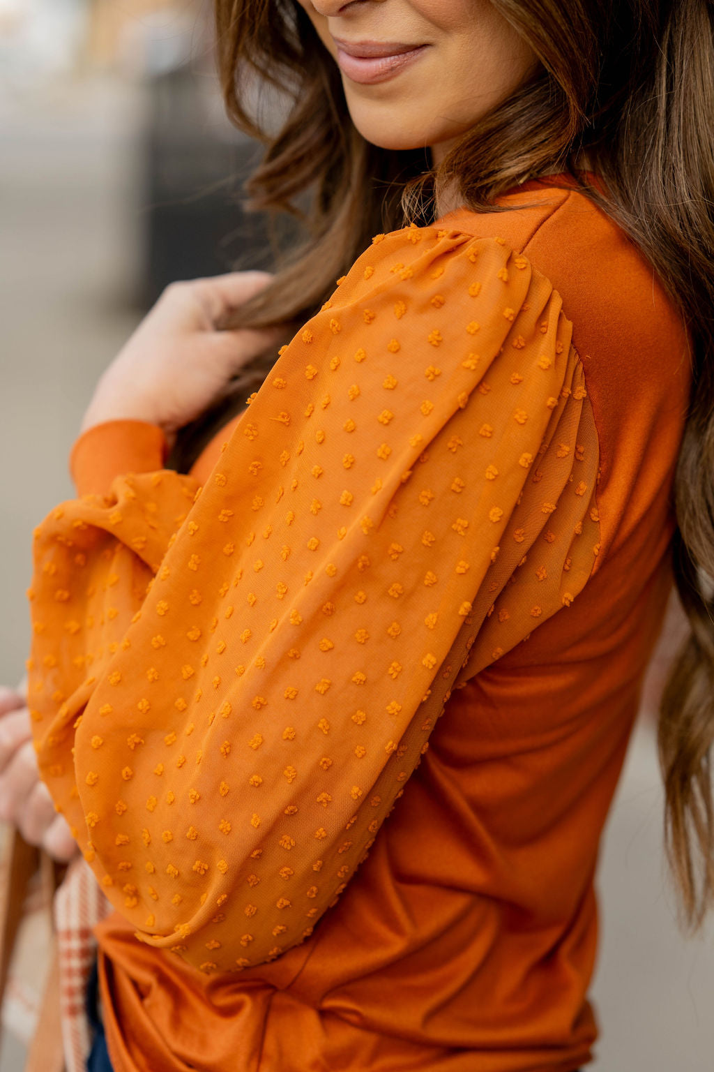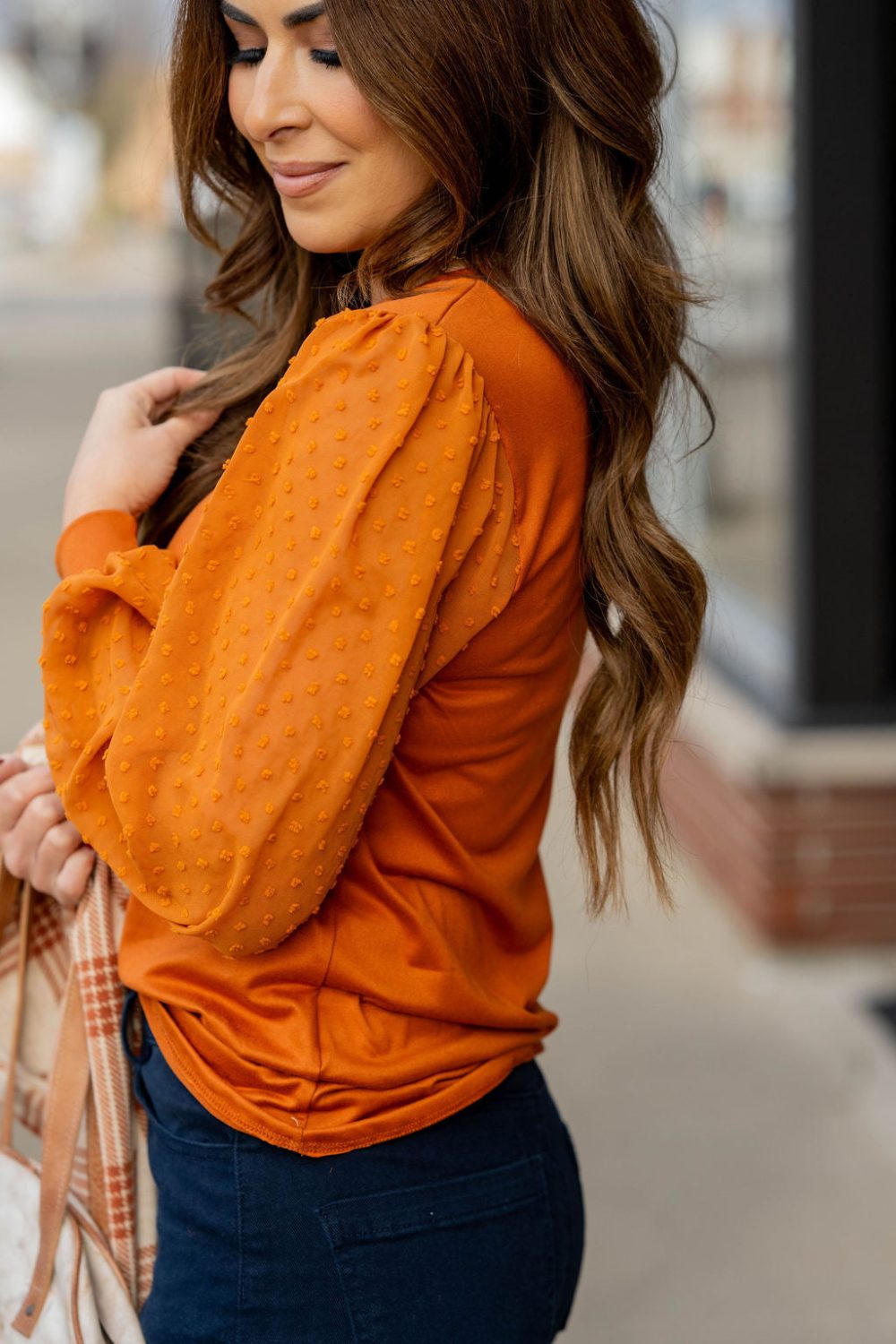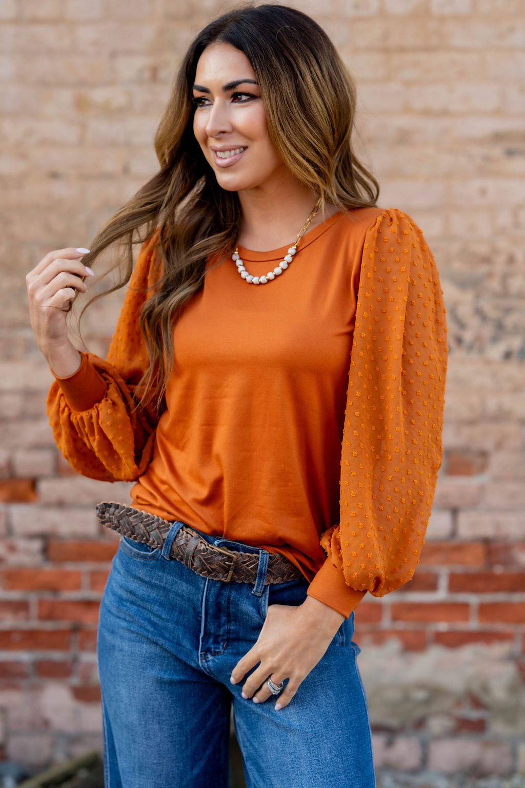 The soft and comfy tee like body of this blouse really pops against the sheer dot textured sleeves! Lightweight enough to wear alone with shorts or a skirt in the warmer months but can be layered with a vest or cardigan or shacket in the cooler ones! This can also be dressed up or down with ease, making it a staple piece for any girls wardrobe!