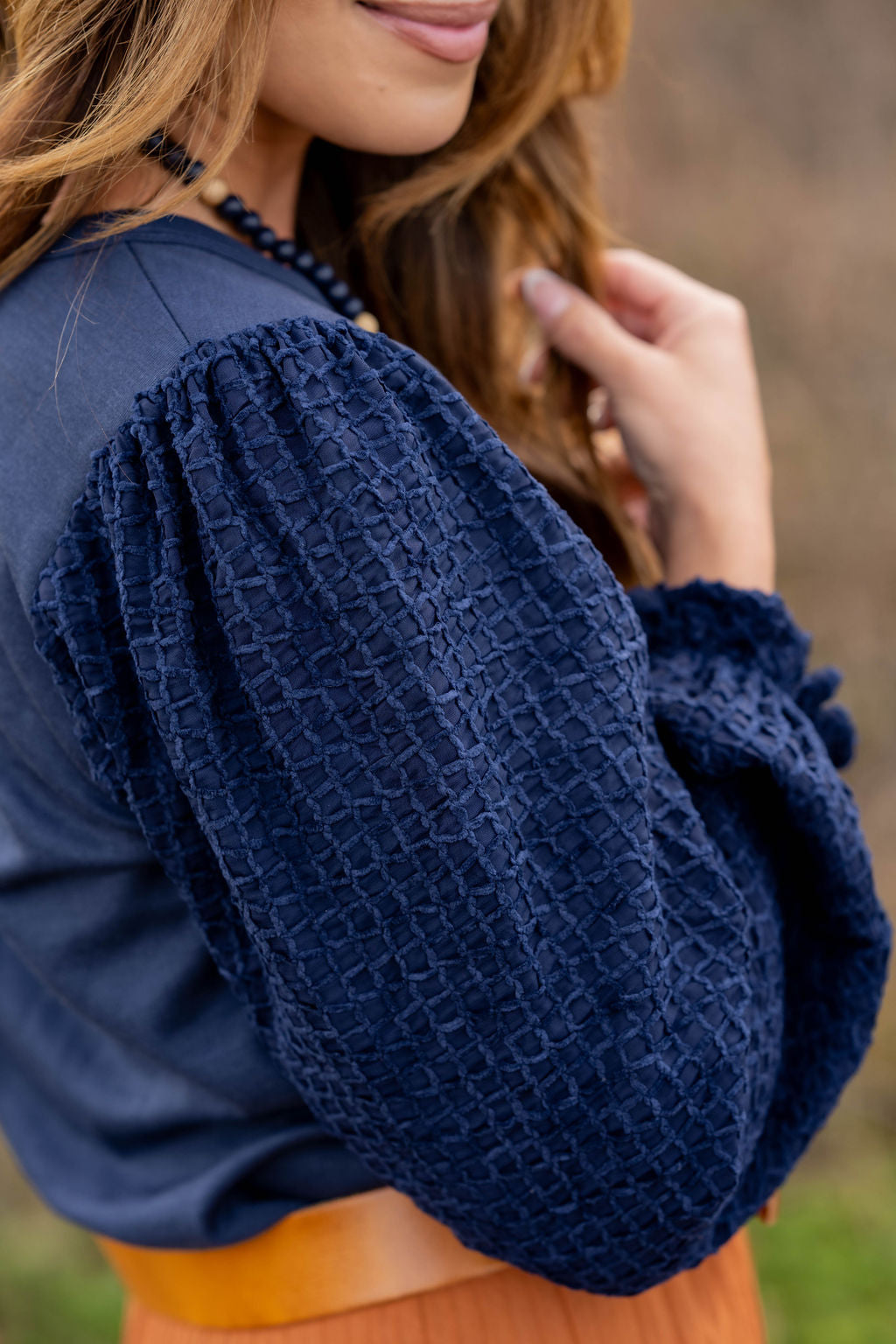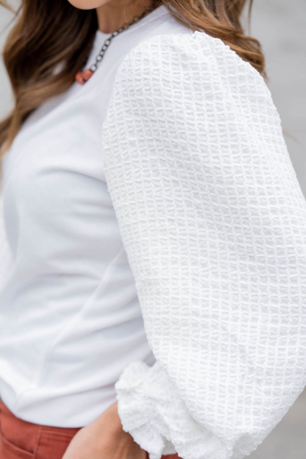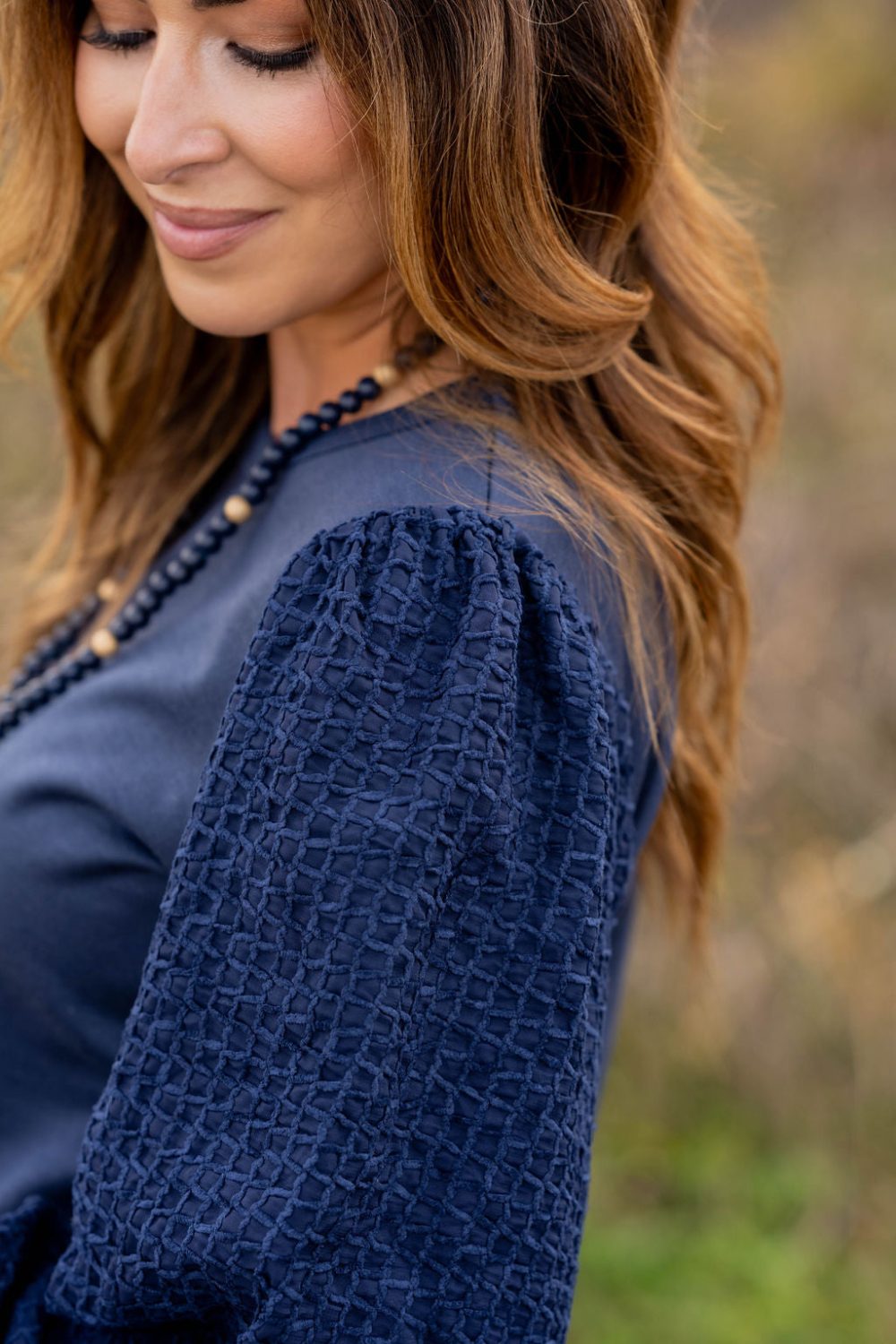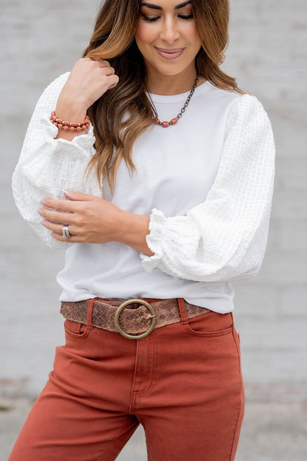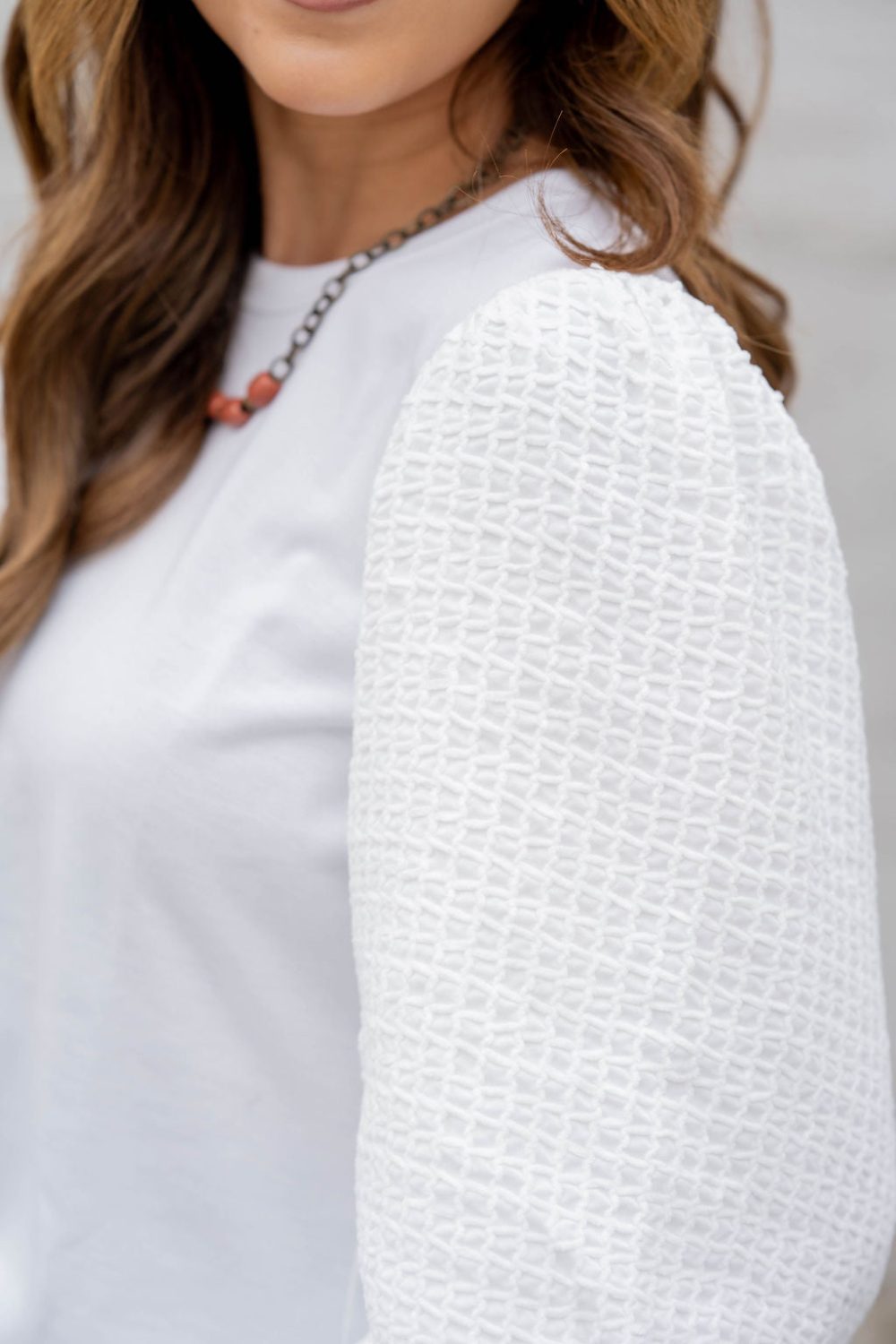 How cute is this blouse? With woven textured sleeves and a solid body, this is a piece that you can dress up or down, depending on what you want! We love the comfort of a tee and the look of a blouse within this piece. The cinched detailing on the sleeves elevates this top. It also looks great with a cardigan, vest, blazer, or jacket over it!